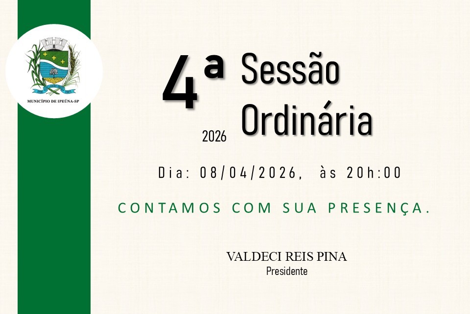 Convidamos a população para participar da 4ª Sessão Ordinária no dia 08/04/2026, as 20 horas no Plenário da Câmara Municipal, na Rua 01, nº 275, Centro.
