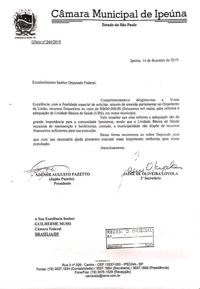 Autoridades do Município de Ipeúna estiveram em Brasília – DF, ocasião em que foram atendidos por Autoridades Federais e protocolaram diversas solicitações de recursos financeiros especialmente nas áreas da saúde, infraestrutura, educação e segurança, para proporcionar melhorias nos serviços prestados a todos os munícipes.