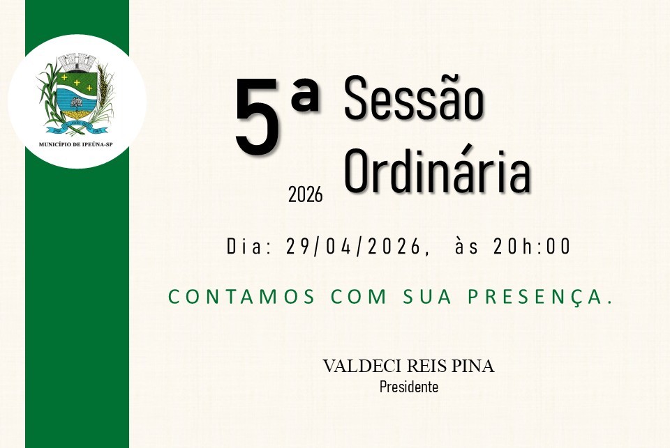 Convidamos a população para participar da 5ª Sessão Ordinária no dia 29/04/2026, as 20 horas no Plenário da Câmara Municipal, na Rua 01, nº 275, Centro.