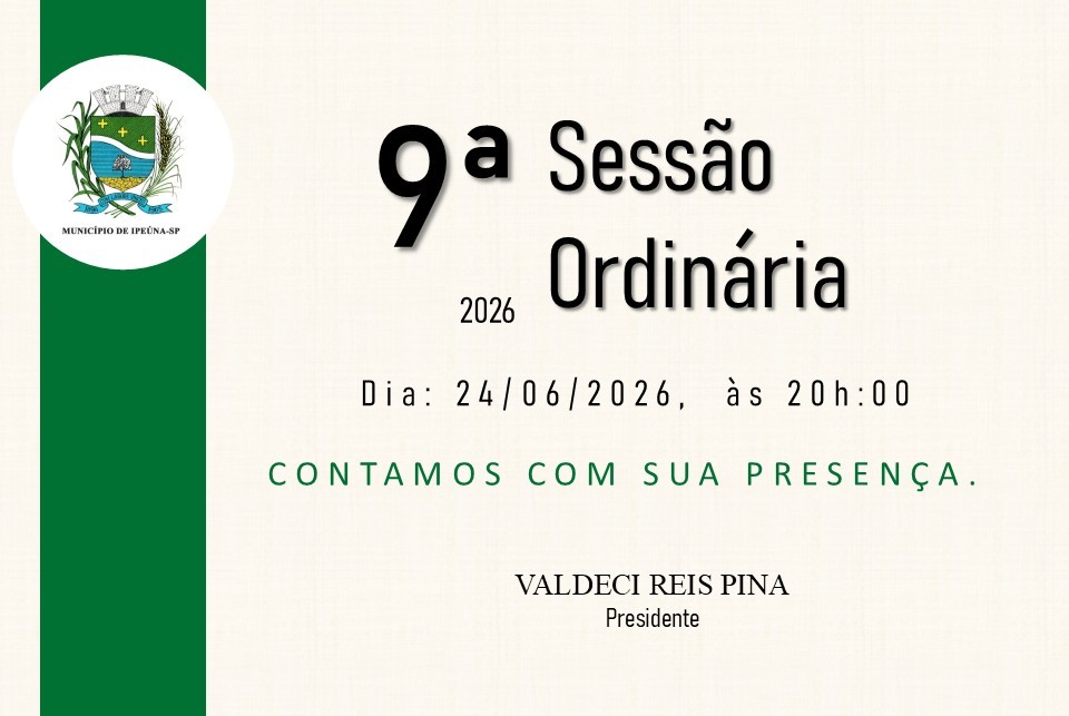 Convidamos a população para participar da 9ª Sessão Ordinária no dia 24/06/2026, as 20 horas no Plenário da Câmara Municipal, na Rua 01, nº 275, Centro.