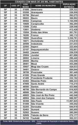 O IBGE (Instituto Brasileiro de Geografia e Estatística) divulgou na sexta-feira (28) as estimativas das populações nos 5.570 municípios brasileiros. A data de referência é 1º de julho. Estima-se que o Brasil tenha 204,5 milhões de habitantes e uma taxa de crescimento de 0,83% de 2014 para 2015. Desse total, 44.396.484 residem no Estado de São Paulo, que concentra 21,7% da população total do país.