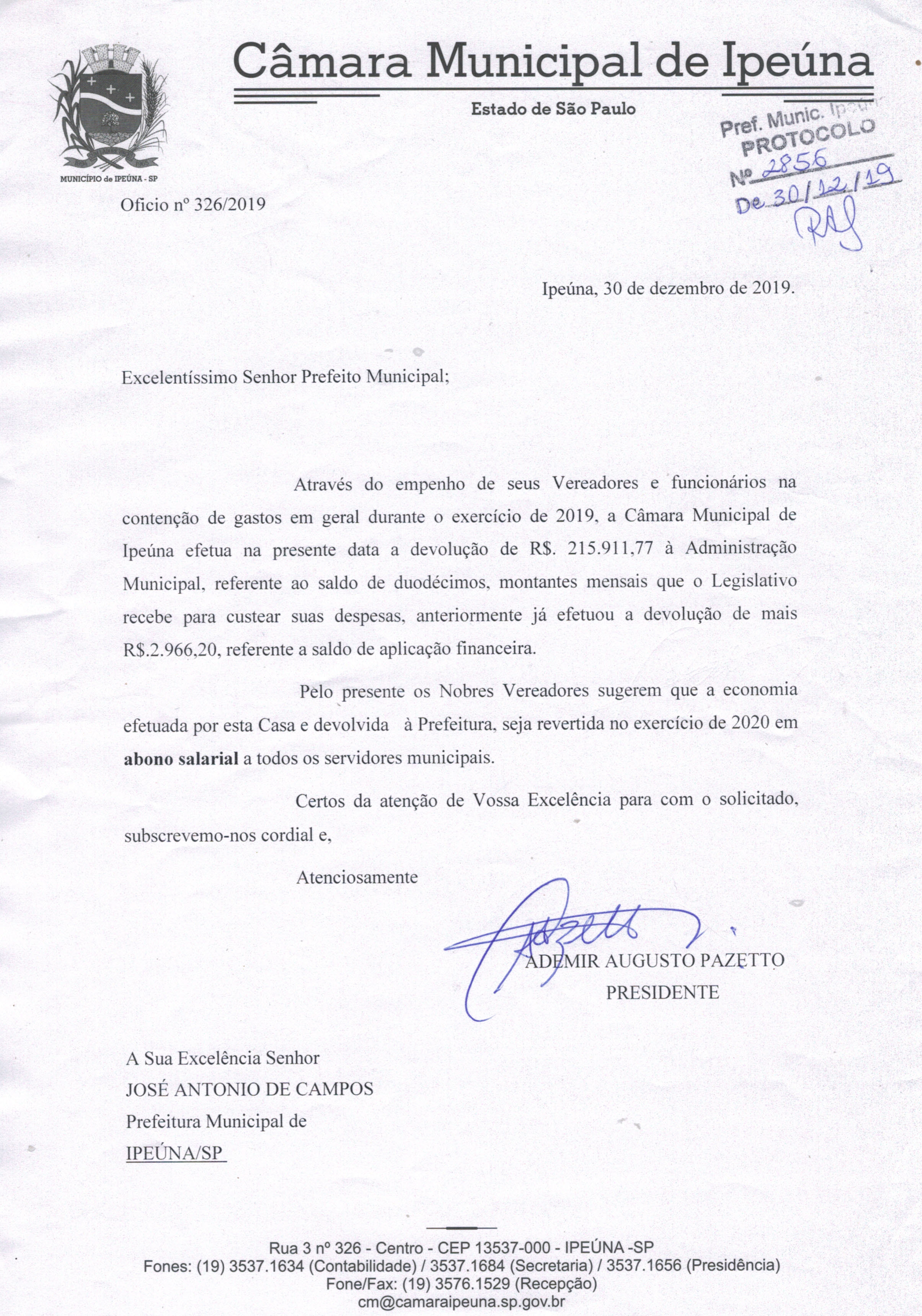 A Câmara Municipal de Ipeúna, através de seu Presidente Japão Pazetto, protocolou junto à Prefeitura Municipal de Ipeúna o ofício nº 326/2019, de 30/12/2019, encaminhando devolução no valor de R$ 215.911,77, referente a saldo de duodécimos do exercício de 2019. Na ocasião registrou sugestão de todos os Vereadores que, com a economia efetuada por esta Casa, seja concedido abono salarial a todos os servidores municipais.
